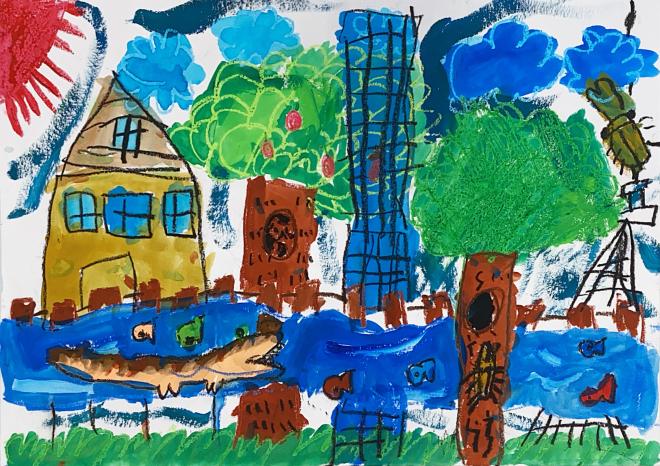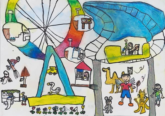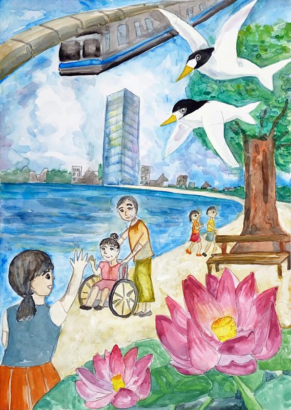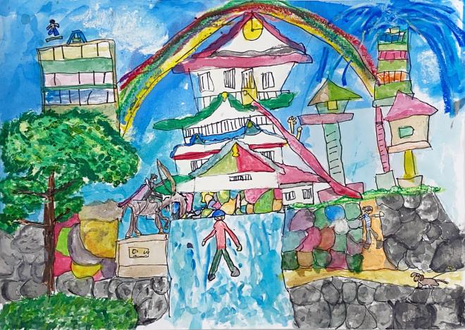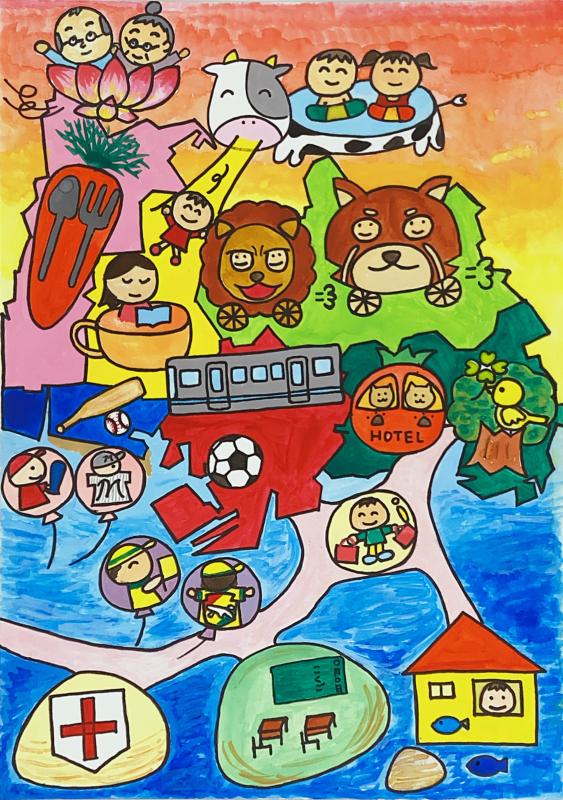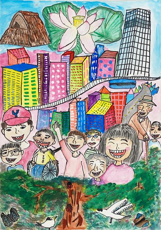 子供から高れい者、障害者、外国人が安心して暮らせる街を創っていきたいと思って描きました。