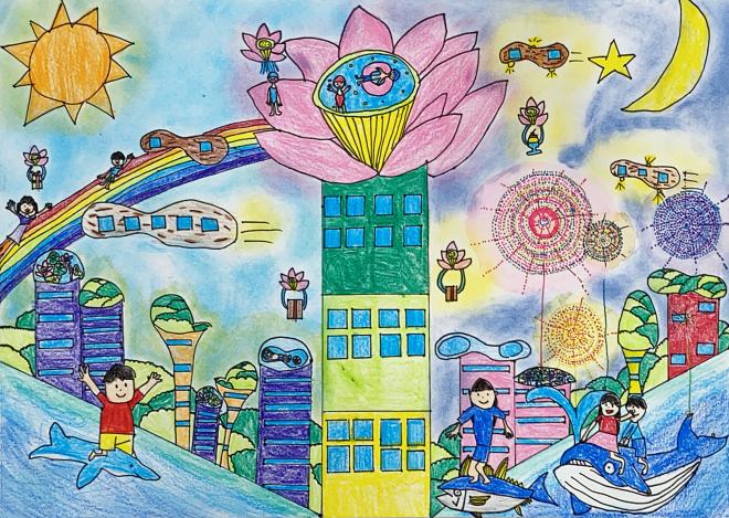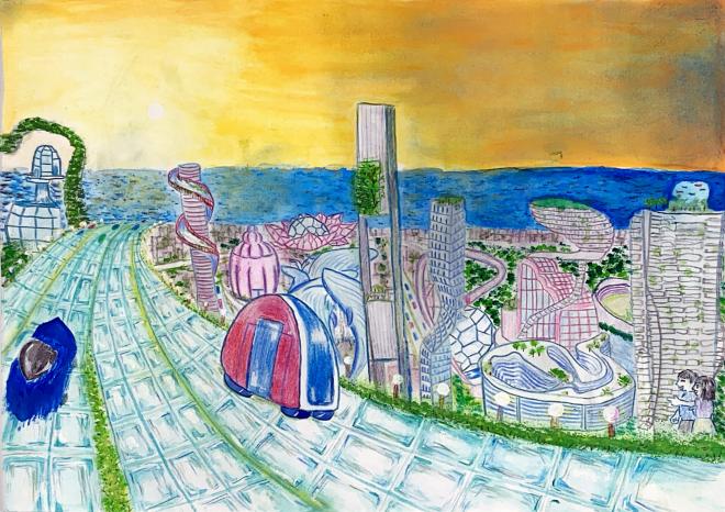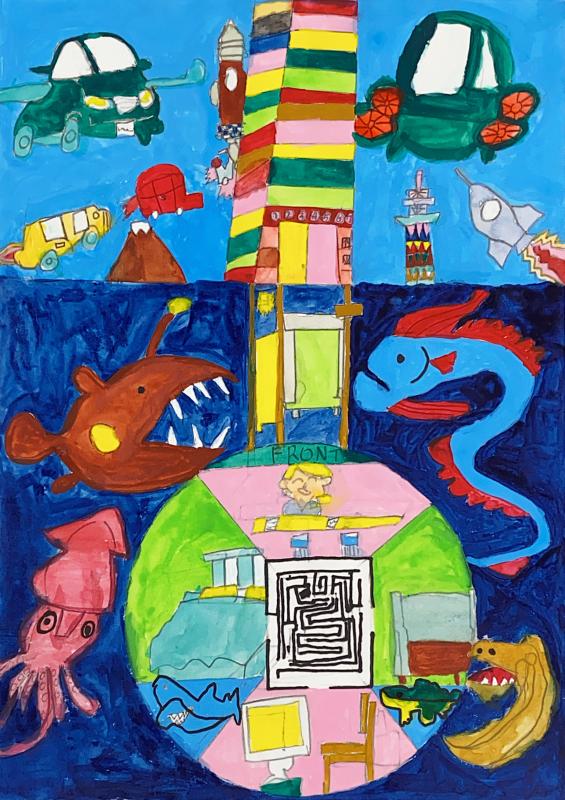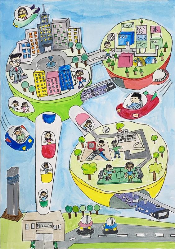 1000年先の未来の千葉市をイメージした作品で、スケールの大きさを感じます。地球に見立てた千葉市を大きく描き、細かな風景の描写も楽しい表現となっています。色使いや色彩も丁寧な画面構成で素晴らしい作品です。