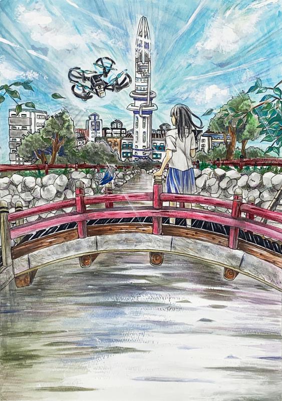 今年で千葉市制100周年なので1000年先まで千葉市が発展していってほしいなと思い、1000周年の絵にしました。