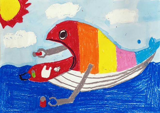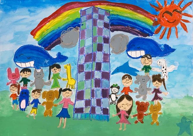 ポートタワーのまわりで、動物もクジラもイルカもヒトもみんなニコニコと仲よく集まってあそべたらいいなと思ってかきました。