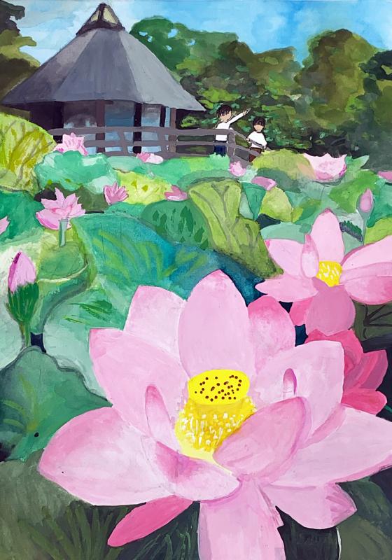 ハスのピンク色、大きな花びらが好きなのでハスの絵をかきました。特に千葉公園のハスがとてもきれいだと思います。