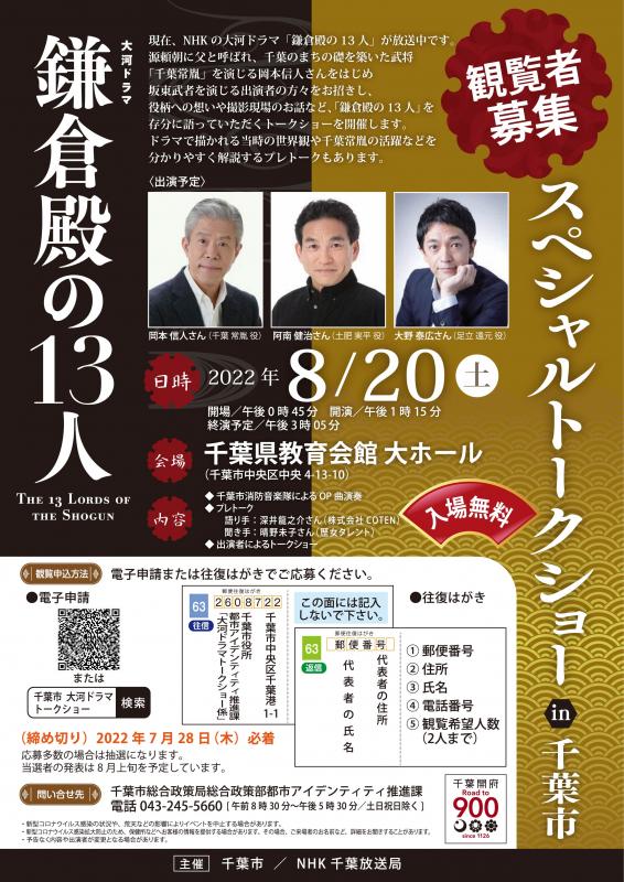 千葉のまちの礎を築いた武将「千葉常胤」を演じる岡本信人さんをはじめ、坂東武者を演じる出演者の方々をお招きし、役柄への想いや撮影現場のお話など、「鎌倉殿の13人」を存分に語っていただくトークショーを開催します。