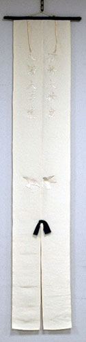 『吾妻鏡』によると、文治5年(1189)6月24日、頼朝は義経をかくまったことを理由に奥州藤原氏への攻撃を決意すると、常胤に御旗一流を調進するように命じました。常胤は、同年7月8日に、新調の御旗を頼朝に献じました。 旗は頼朝の先祖の源頼義が、永承6年(1051)に始まる前九年の役で使った御旗の寸法に合わせたもので、一丈二尺(約363cm)二幅、白糸の縫物があり、上に伊勢大神宮・八幡大菩薩、下に相対した鳩二羽が縫いこまれていたとされています。