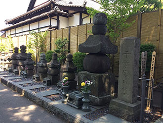 寺伝に、天平宝字元年(757)に創建と伝えられる古刹です。第二次大戦後今の稲毛区轟町に移転するまでは、千葉神社の南、今の通町公園にありました。境内には16基の五輪塔があります。これは常胤の祖父の平常兼から室町時代の当主千葉胤直、胤将父子までの千葉氏歴代の墓碑といわれています。