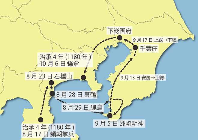 常胤は下総国の目代※を攻撃し、千葉に侵攻してきた平家方の藤原親政と合戦し(結城浜の戦い)勝利します。常胤ら両総平氏が頼朝に味方することにより、周辺の武士団も同調しました。