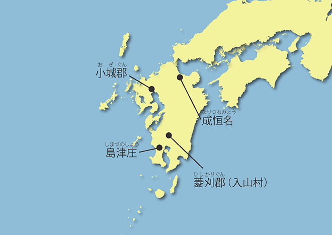 常胤は壇ノ浦の戦いでの平家の滅亡後も、九州に留まって戦後処理にあたりました。その結果、豊前国上毛郡成恒名(今の福岡県築上郡上毛町)、肥前国小城郡(今の佐賀県小城市)、薩摩国島津庄寄郡(今の鹿児島県薩摩川内市)内の五つの郡、大隅国菱刈郡入山村(今の鹿児島県伊佐市)に所領を得ました。