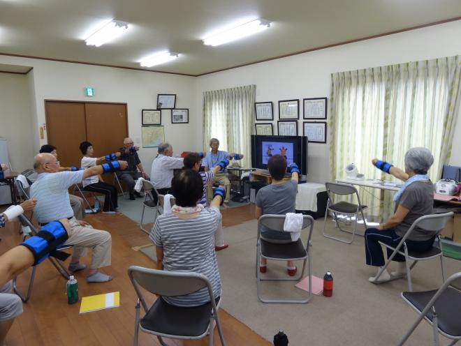 みなさん、姿勢が正しく、数を数える際も大きな声で体操を行っており、とても若々しく、こちらも元気をいただきました。また、腕や脚を挙げる運動では、1本100グラムの重りをつけて行っており、1本でも繰り返すことでかなりきつく感じましたが、女性の方でも3本、指導してくれている方は、5本もつけており、驚きました。