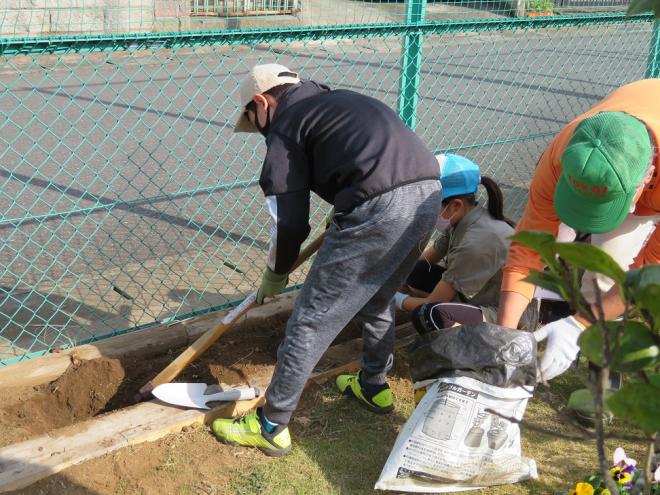 今回は、11月13日(日曜日)に行われた、子ども花壇作りのイベントに参加させていただきました。かわど手づくり公園は地域住民の力のみでつくったとは思えないほどきれいな公園です。通常、公園内の花壇は公園花壇管理部会の方々が中心となり整備を行っており、小学生による花壇の整備はこの日が初めての試みとの事。川戸小学校1~6年生の19名とその保護者の方々が集まりました。子どもたちは3つのグループに分かれ、各グループ1つの花壇を担当します。腐葉土やたい肥を土に混ぜ込み土づくりを行った後、グループ内で苗の配置を決めてから植え付けを行っていきます。別の花壇では、公園花壇管理部会の方々による植え付けも行われていて、子どもたちは、鍬の使い方や苗の配置の際の注意点などを協議会の方々から丁寧に教えてもらいながら作業を進めていました。花壇の整備だけでなく、地域の方々とのかかわり合いは子どもたちにとっても良い経験になったのではないでしょうか。