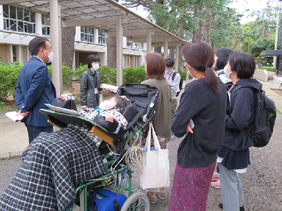 車がつかえない場合のことを想定して、土砂崩れや倒木、電線の落下などを考え、訓練を徒歩で行いました。最短ルートでの避難は難しそうなので、少し遠回りにはなりますが安全だと思われるルートで訓練開始。千葉明徳学園の入り口では担当の方がお待ちくださっていて、災害発生時の千葉明徳学園の開門状況等をご説明してくださいました。入口からは坂が続き、人工呼吸器+半日分の最低必要物品を乗せた車いすを押すのはとても大変そう。学園内でも車椅子の方が問題なく通ることのできるルートをご案内くださったり、要支援者の方の避難所になる予定の場所を見学させていただいたり、災害発生時に必要だと考えられる備品の有無についてご説明くださったりしました。その情報を基に、個別避難計画を考えていきます。