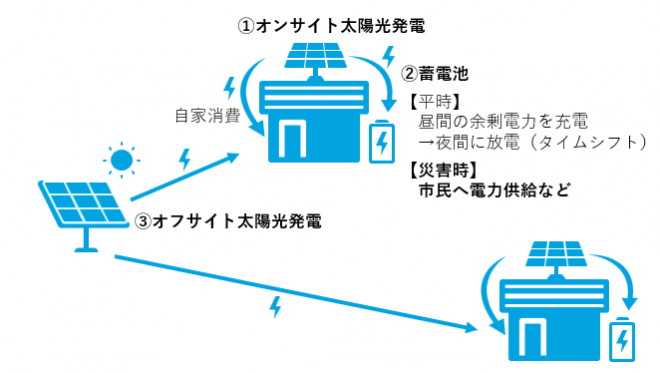オンサイト太陽光発電設備と蓄電池の導入を進めることで、平常時には昼間に発電した余剰電力を蓄電池に蓄え、発電がない夜間に利用することで再生可能エネルギーを効率的に活用することができます。さらに、災害などによる停電時にも、発電設備と蓄電池から供給される電力を使用することが可能となります。