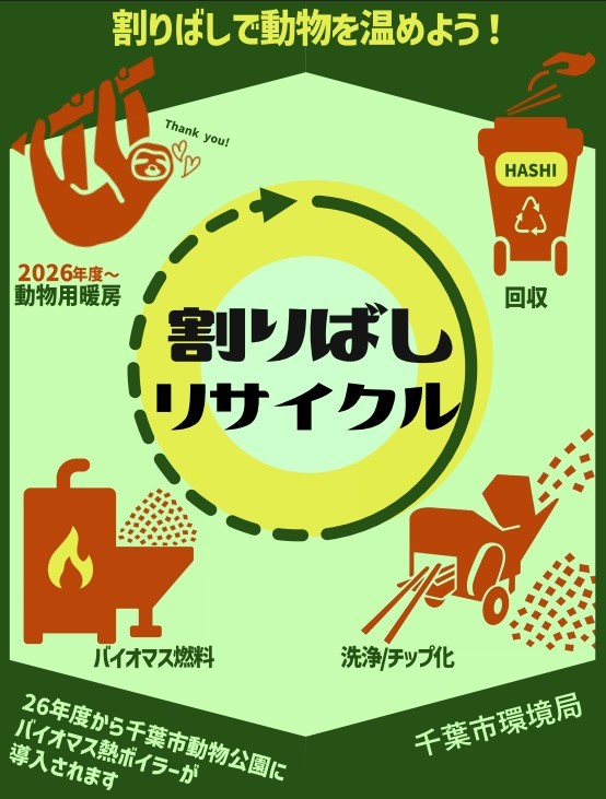 2026年度からは千葉市動物公園内の科学館に導⼊される「バイオマス熱ボイラー」で、回収した割りばしと市内で回収した剪定枝を燃料として使う予定です。