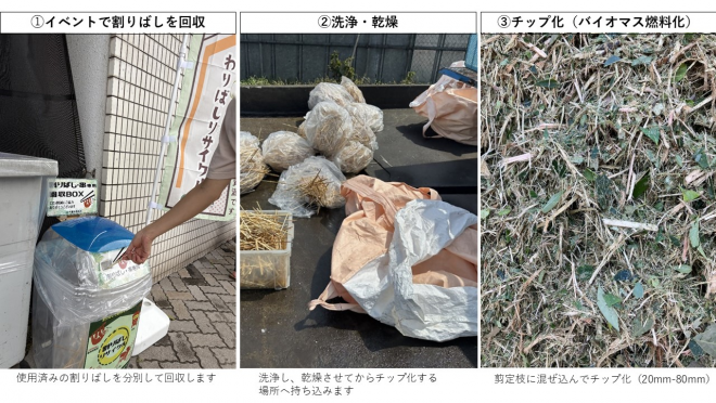 先⾏地域の取組みの⼀つとして、市⺠やイベント参加者が「脱炭素」について考えるきっかけになるよう、イベント会場で使い終わった割りばしを回収しています。