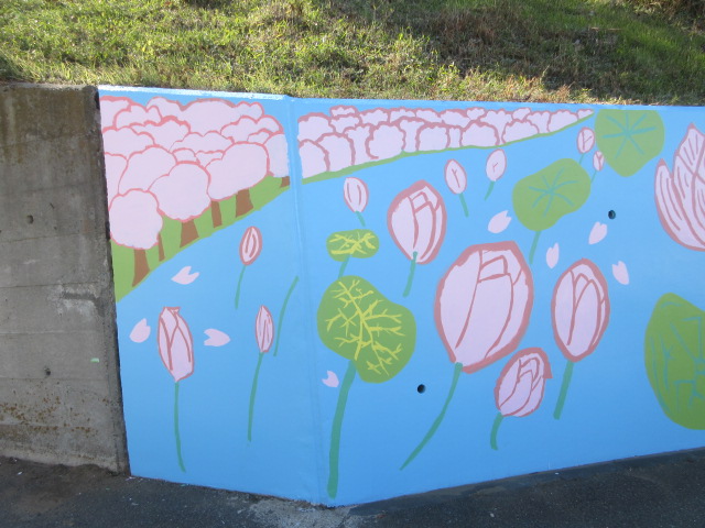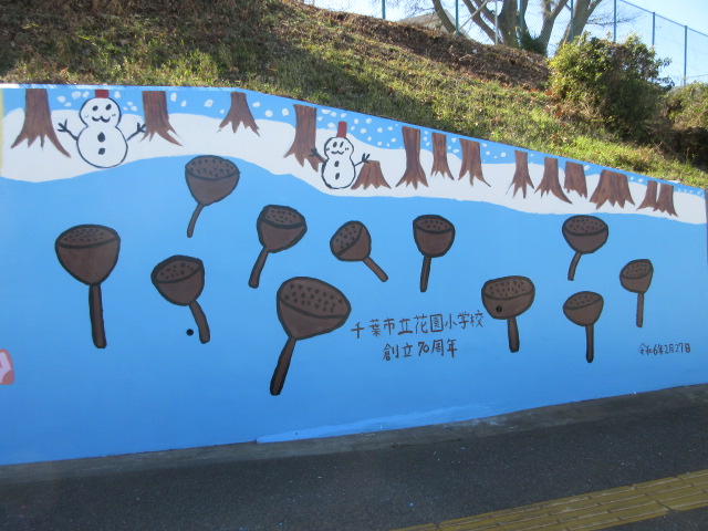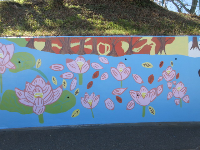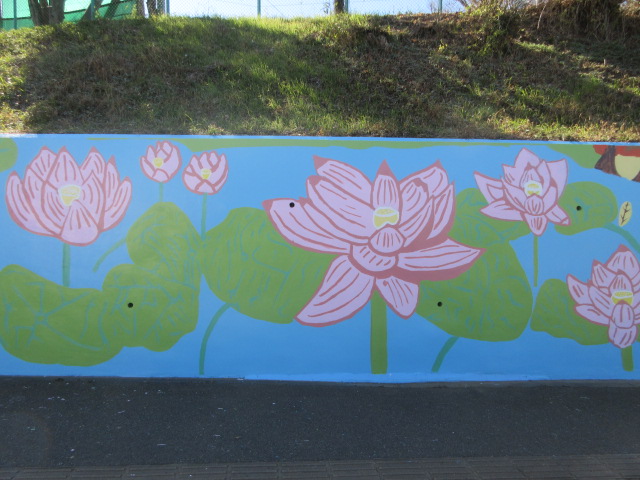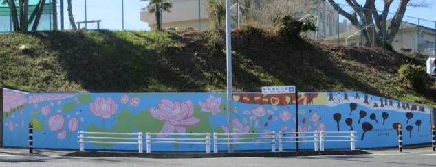 花見川区では、区内の「現東京大学検見川総合運動場」でオオガハスの実が発掘されたことから、「オオガハスを身近に感じるまちづくり」を推進しています。このたび、その取り組みの一環として、千葉市中央塗装協同組合の協力のもと、市立花園小学校の児童によるオオガハスをモチーフにした壁画を作成しました。