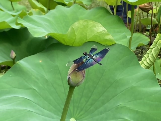 ハスのつぼみにとまる美しい羽根のチョウトンボ