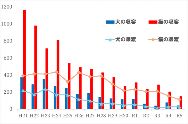 ・千葉市では、猫の収容頭数を減少させるため、平成23年度から飼い主のいない猫の不妊手術事業を開始し、令和4年度末までの12年間で約4,000頭の手術を実施しました。現在では、事業開始前と比べ猫の収容頭数は3分の1以下になっています。また、令和4年度からは年間の手術実施予定頭数を従来の300頭から360頭へ拡充いたしました。