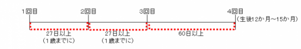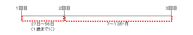 1回目から27日以上の間隔をおいて2回目を接種し、2回目から60日以上の間隔をおいて、なおかつ1歳以降に1回の追加接種。