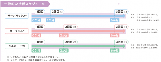 ※同じワクチンでの接種が原則ですが、1~2回目を2価または4価ワクチンで接種済みの方で、残りの接種を9価ワクチンで接種希望の場合は医師にご相談ください。