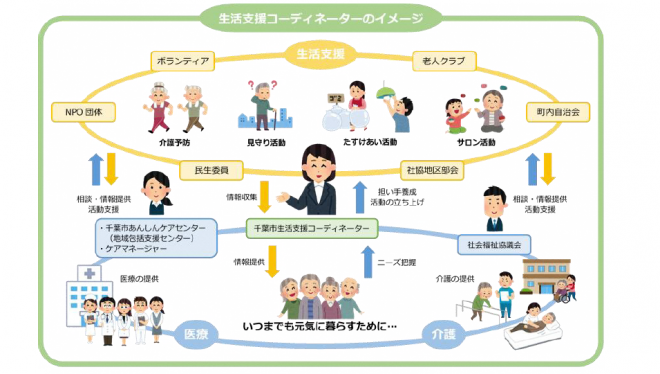生活支援体制整備事業を推進するために、「地域づくりや地域支えあいの推進・支援」を担っているのが、「生活支援コーディネーター(地域支えあい推進員)」です。
