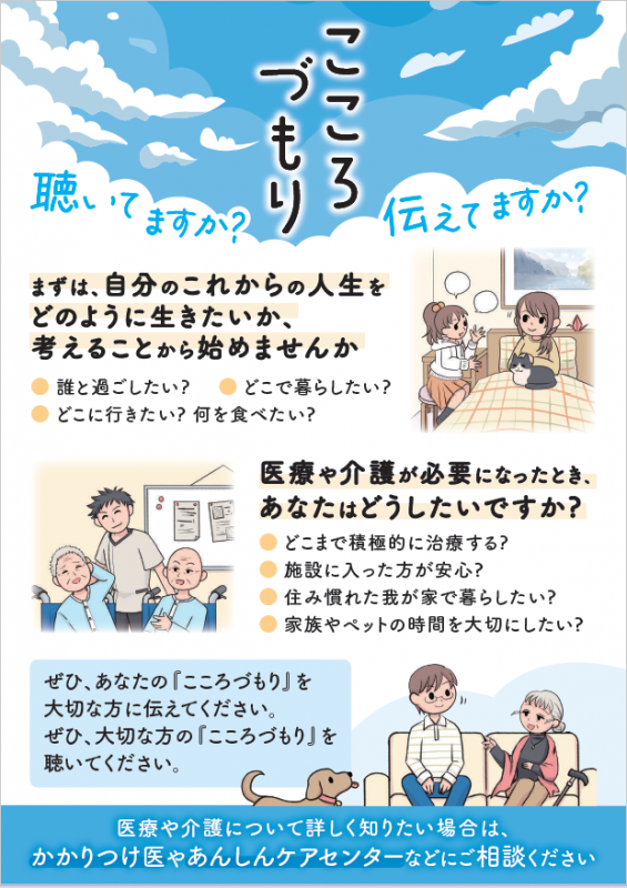 当センターでは、誰もが尊厳をもって、可能な限り住み慣れた地域で自分らしく生活できるよう、「人生の最終段階における意思決定支援(ACP(アドバンス・ケア・プランニング)愛称:人生会議)」の普及啓発に取り組んでおります。