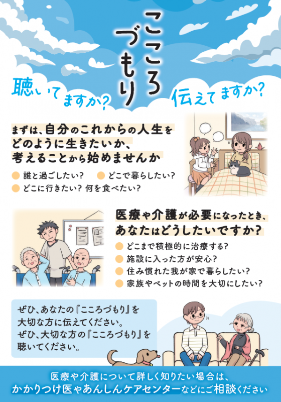 ホーム > 市政全般 > 組織案内 > 組織から探す > 保健福祉局 > 保健福祉局健康福祉部在宅医療・介護連携支援センター > こころづもり 聴いてますか? 伝えてますか?(意思決定支援 普及啓発事業)