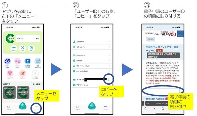 ※ちばシティポイントアプリへの付与を希望される場合、ユーザーID(chibapo_から始まる英数字記号で構成された36桁)が必要になります。正しくユーザーIDを入力するため、アプリからコピーし、直接電子申請の項目に貼り付けてください。
