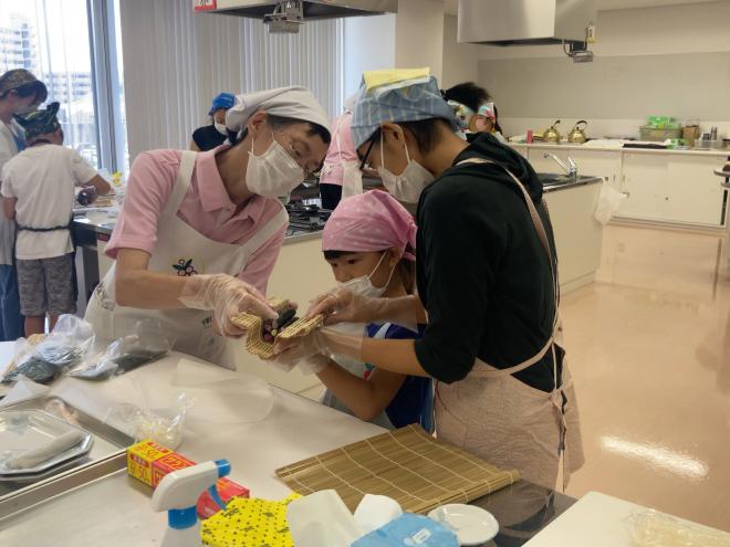 小学生の親子を対象に夏休みに太巻き寿司の教室「プロから学ぶ食育教室」を実施しました。