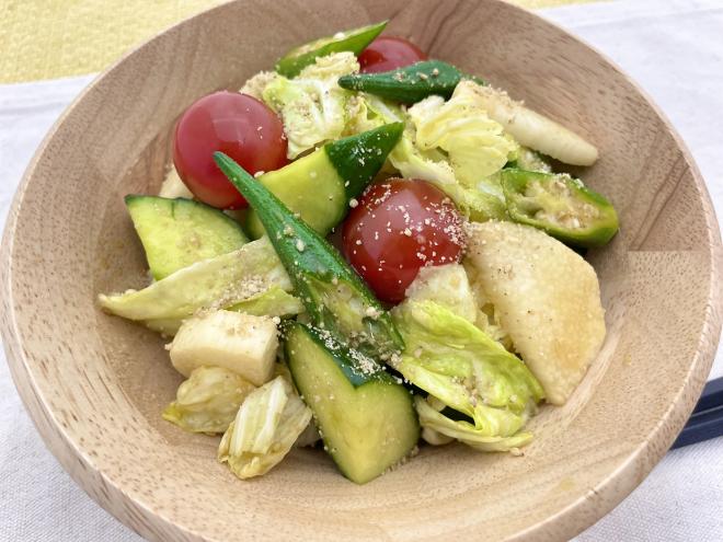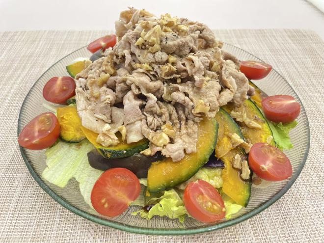 【減塩と調理のポイント】ナッツのアクセント、こしょうの辛みと香り、酢の酸味で少ない塩分でもおいしくいただけます。この1品で1日に必要な野菜の2分の1量がとれます。夏バテ対策にもどうぞ。