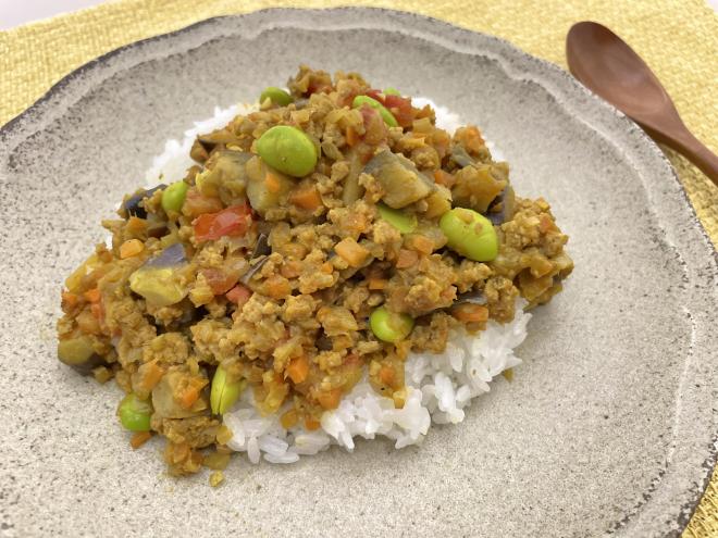 【減塩と調理のポイント】たくさんの野菜のうまみとカレー粉の香りで、おいしく減塩できます。刻んだ材料を炒めるだけで簡単に作ることができるので、親子で一緒に作ってみていはいかがでしょうか。