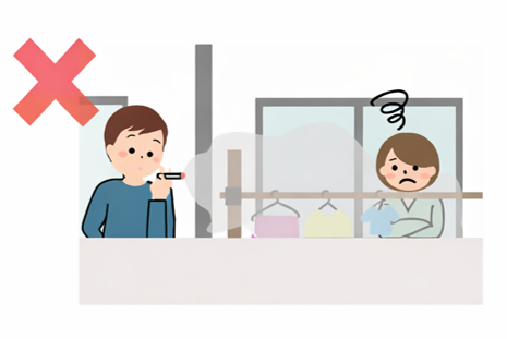 自宅は同居家族が受動喫煙を受けやすい場所です。換気扇の下や空気清浄機では有害物質を完全に除去することはできません。ベランダや庭などでの喫煙も知らず知らずのうちに近隣の方の迷惑になっている場合がありますので配慮が必要です。なお、ご自宅での受動喫煙被害については居宅内での喫煙による受動喫煙被害について(別ウインドウで開く)をご確認ください。