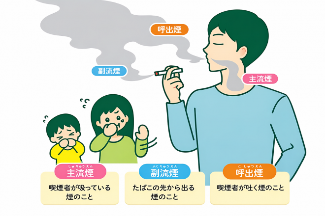 たばこの煙には、喫煙者が吸っている「主流煙」のほかに、たばこの先から出る「副流煙」と喫煙者が吐く「呼出煙(こしゅつえん)」があります。受動喫煙は「副流煙」「呼出煙」から起こります。特に「副流煙」には、「主流煙」よりも多くの有害物質が含まれています。