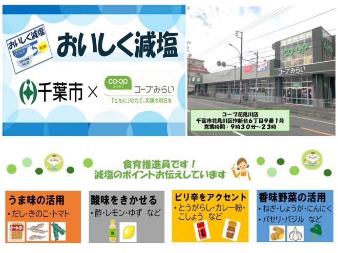 店舗での野菜摂取や減塩の啓発POP掲出、減塩商品や減塩で活用出来る食品の特設コーナーや千葉市食育推進員によるおすすめ減塩レシピの配布等。