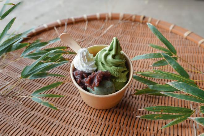 | ミルクバースタンド26時の抱擁 | ミルクバースタンドとマルシェ、いのはな団子抹茶ソフト(600円) |
