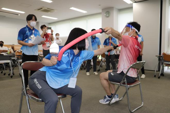 千葉県内4大学の関係者が協力し考案した、特殊な用具がなくてもできる車いすフェンシングをモチーフにした新しいパラスポーツ「ソフトパラフェンシング」を体験。