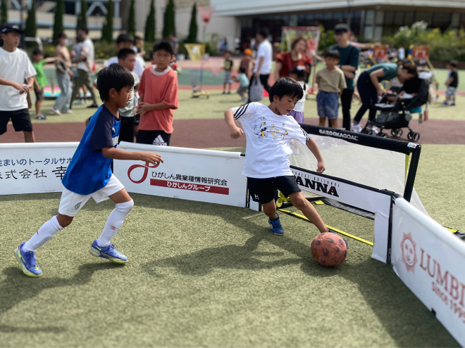 5mの囲いの中で行うサッカーを体験。弾まないデニム生地の専用のボールを使い、1人対1人で行います。常のゴールでの得点以外に相手の股の間にボールを通すと、即勝利というルールがあります。また、体をぶつけることも禁止なので、小さなお子様でも安心してサッカーを楽しむことができます。