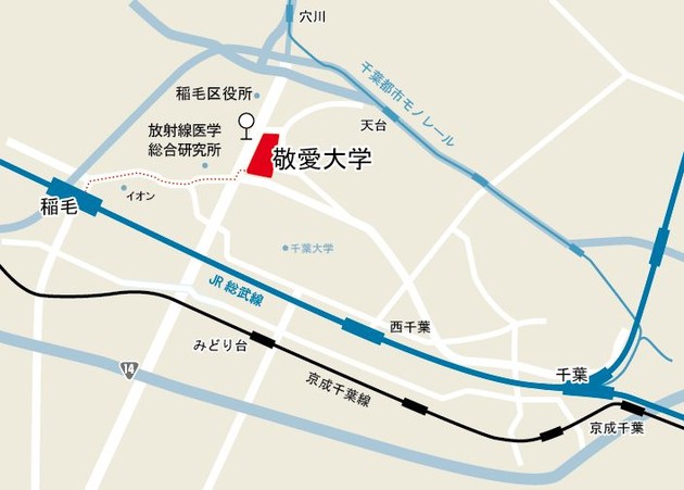 敬愛大学稲毛キャンパス(住所:千葉市稲毛区穴川1年5月21日(外部サイトへリンク)) |