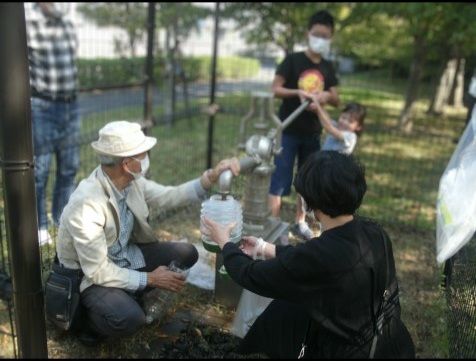 災害時に生活用水を確保できるように、手押し井戸の場所の確認と、水運び訓練をしました。また、ロープワークを学びながら、ブルーシートでテントを作る体験会も行いました。