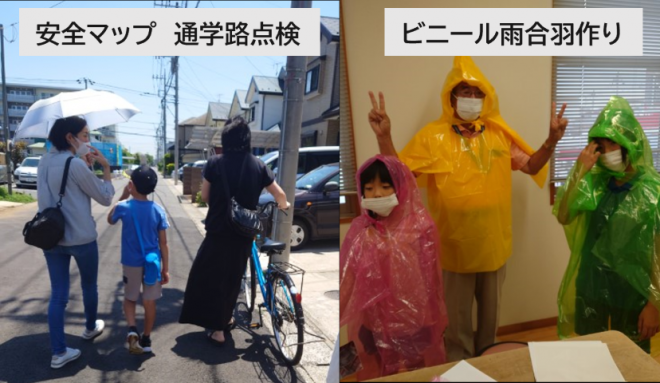 通学路安全マップ作り、段ボールトイレ・ビニール雨合羽をつくろう、などの実践的なワークショップの開催を通じて、親睦・コミュニケーションを深めています。