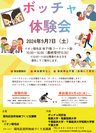 令和6年9月7日(土)にボッチャ同好会、敬愛大学・敬愛短期大学、千葉経済大学・千葉経済大学短期大学部、千葉大学の共催、イオン稲毛店の協力のもと、ボッチャの体験会を実施しました。