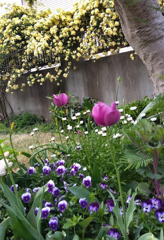 1.米元加奈子 2.園生町 3.令和7年4月22日 4.「卯月の庭」カラフルな4月の庭です。 5.木香薔薇、チューリップ、ビオラ等 |
