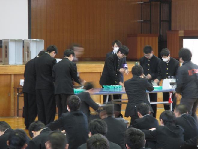 模擬投票の後は、各クラスの選挙管理委員の生徒に代表して開票作業を体験してもらい、その場で開票結果の発表をしました。