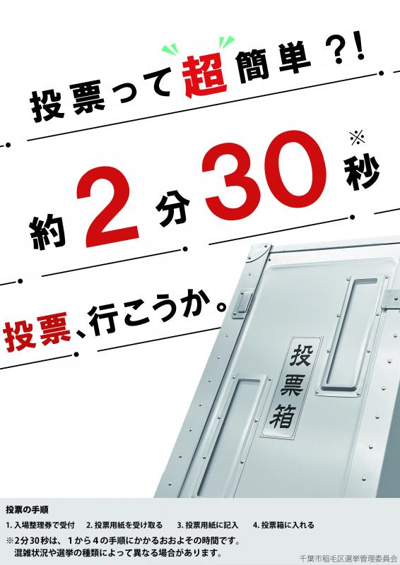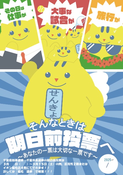 完成したポスターは、今度の千葉県知事選挙及び千葉市長選挙の期日前投票所を設置するイオン稲毛店に掲示します。
