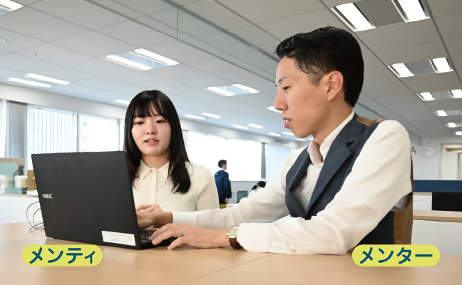 普段の業務で分からないことがあればすぐに相談してもらい、すぐに答えを伝えるのではなく、Aさんと一緒に解決策を考えるようにしています。また、メンターとして指導している中での気づきや、業務への理解がより深まったことで、メンティと同じように成長できていると感じています。