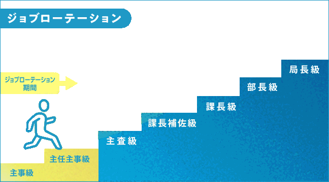 採用後の昇任は、ジョブローテーション期間を経た上で勤務成績などを考慮し、能力主義に基づいた選考により行われます。意欲のある職員を登用するため、主査、課長補佐、課長、部長(区長)職への立候補制度による昇任も行っています。また、女性職員の登用も積極的に行っています。