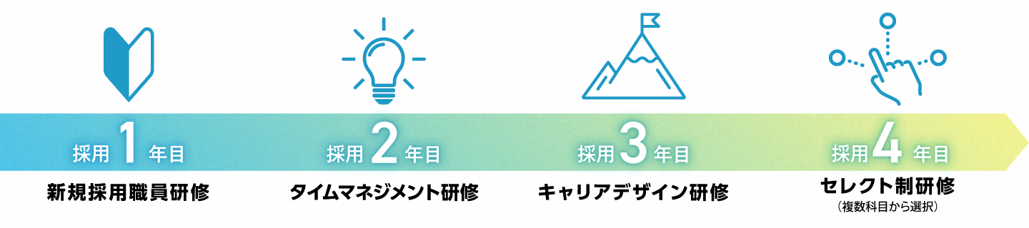 新規採用職員が安心して職務に取り組み、各職場で力を発揮することができるように、採用後4年間を千葉市職員としての基礎を築く重点育成期間と位置付け、集中的に研修を実施します。