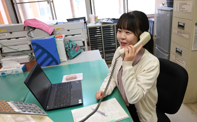 上司や同僚とのコミュニケーションが多く、風通しの良い職場です。困ったときや悩んだときは、自分の担当でなくても一緒に考えてくれたり、助けてくれたりするので、安心して働くことができます。