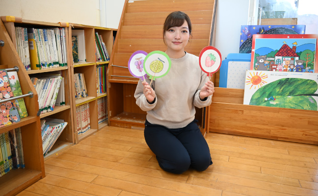 2歳児の担任として、3人の先生方と一緒に職務に就いています。子ども達一人一人のことを理解し、その子の成長を考えながら楽しく過ごすために日々工夫して関わっています。