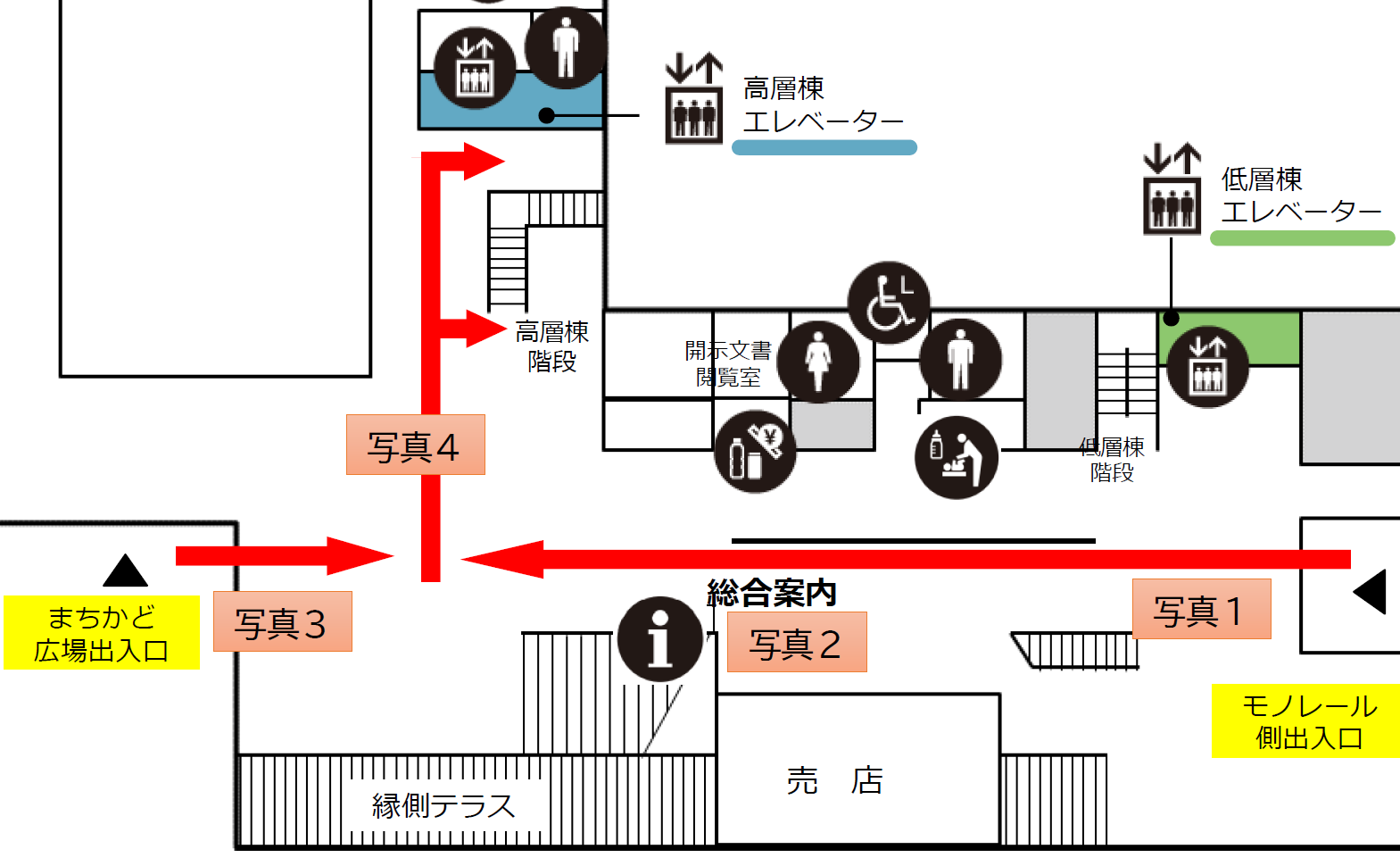 1-2.(モノレール駅側出入口から入る場合)総合案内を通り過ぎたところで右へ曲がり、奥へお進みください。【案内図写真2】