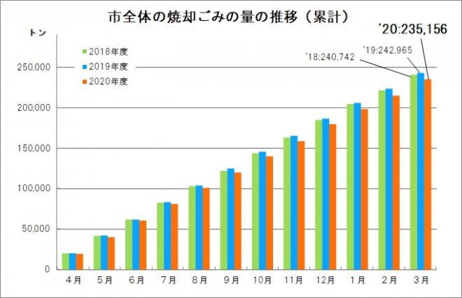 2020年4月から2021年3月までの焼却ごみの量を昨年度の同時期と比較すると、7,809トン(3.2%)の減少となり、2020年度の目標としていた4,300トンの削減を達成することができました。