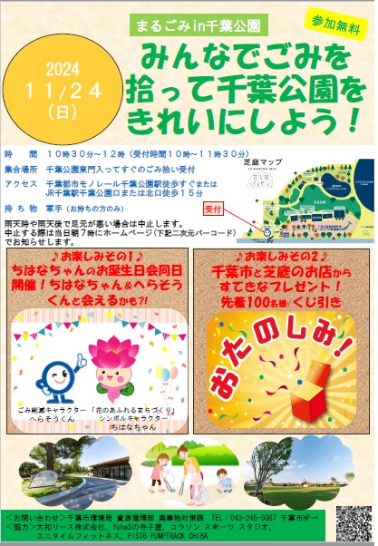 本イベントは、ごみ拾い活動を中心に活動するまるごみJAPANが、毎年11月に開催する「まるごみ(日本まるごとごみ拾い)」の趣旨に千葉市が賛同して実施します。また、11月23日には「ちはなちゃんのお誕生日会(別ウインドウで開く)」同じ芝庭エリアで実施します。