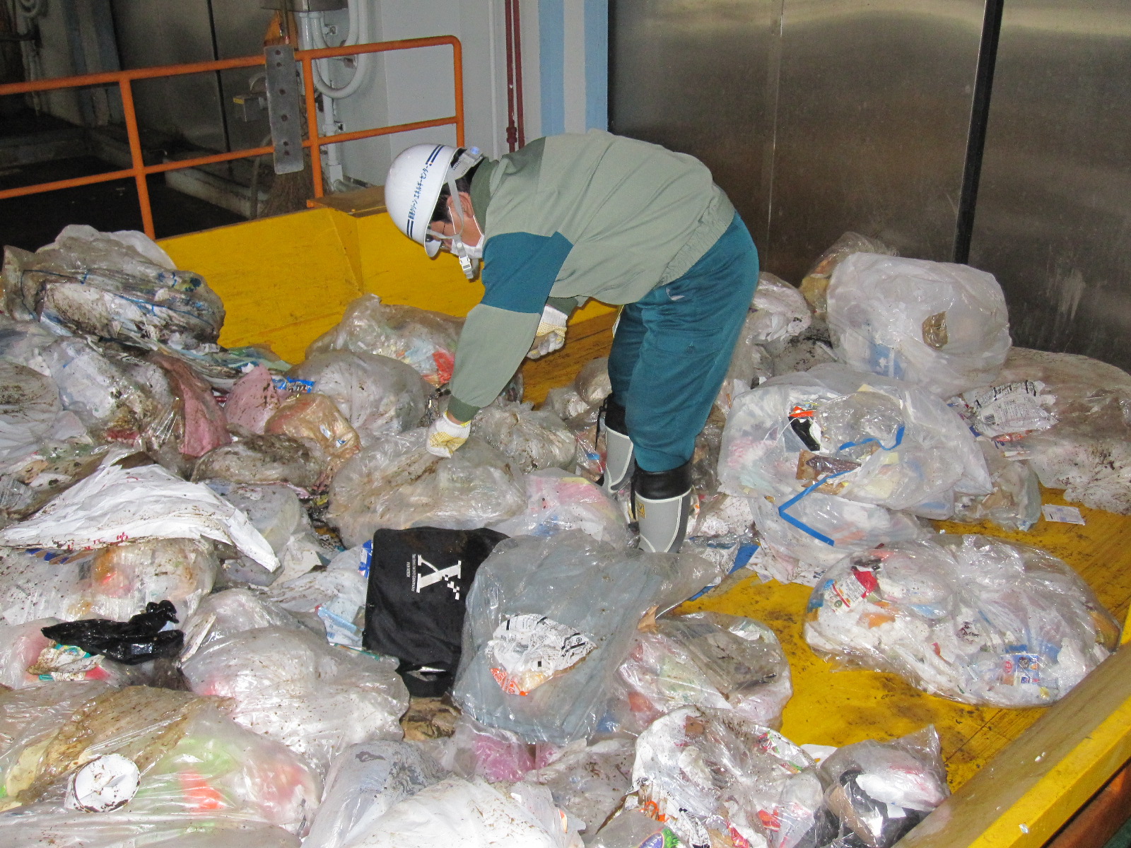 清掃工場に事業所ごみを搬入する車両をランダムに選んで、その搬入物の中身を検査します。ごみピットに投入する前に、搬入物を専用のステージなどに降ろして点検する方法と、ごみピットに投入する際に目視で内容物をチェックする方法があります。
